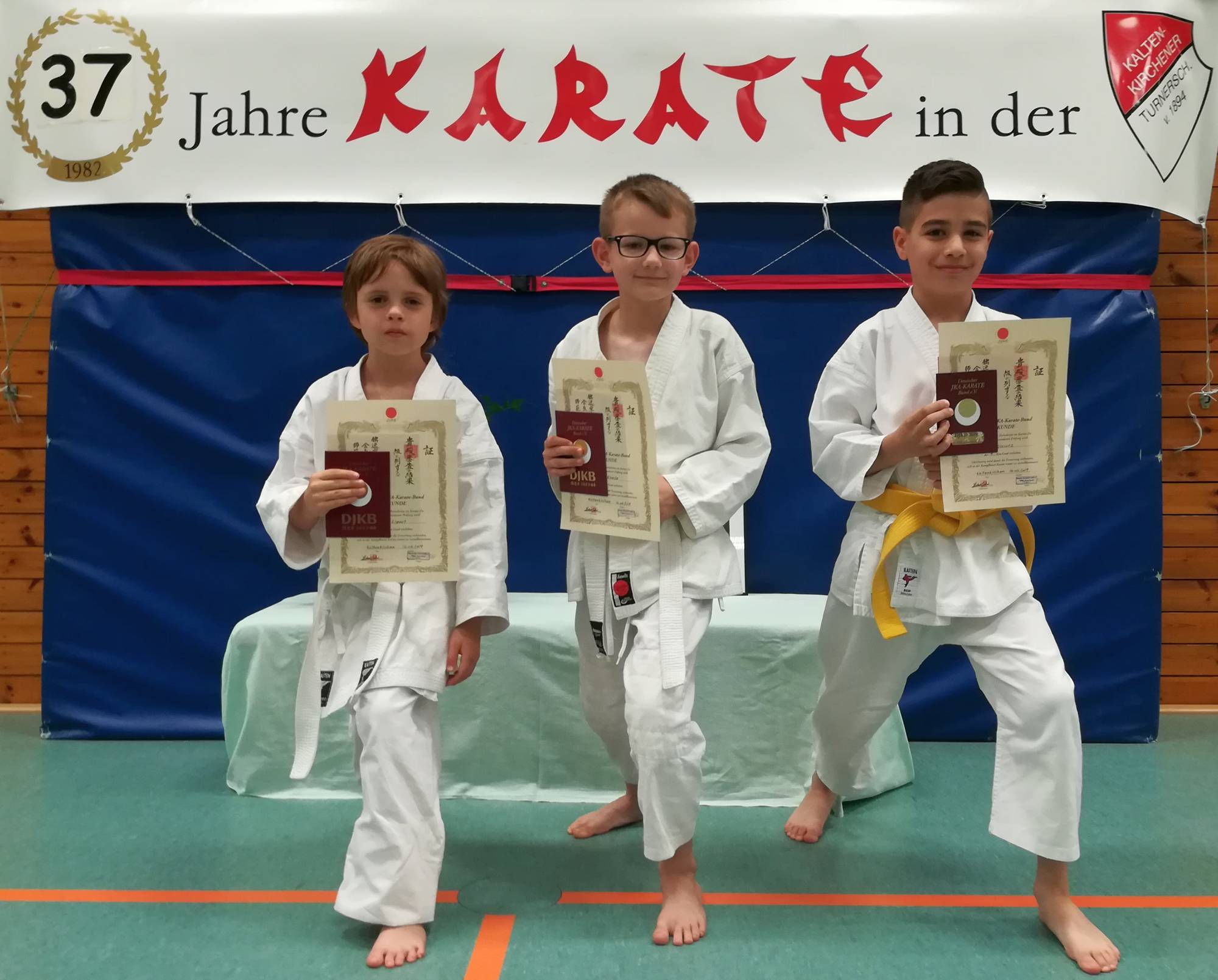 Drei Sportler der Kaltenkirchener Turnerschaft von 1894 e.V. hatten sich in den vergangenen Wochen bereits darauf vorbereitet. Sie präsentierten erfolgreich Kihon (Basistechniken) sowie Kata (Form) und Kumite (Kampf). Damian Eberle und Timothy Lipart bestanden die Prüfung zum 9.Kyu (Weißgurt) und Erik Giarunz bestand die Prüfung zum 7.Kyu (Orangegurt). Die Abteilung Karate gratuliert ihren Prüflingen.