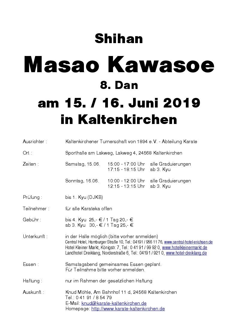 Am 15. und 16.06.2019 lud die Abteilung Karate der Kaltenkirchener Turnerschaft von 1894 e.V. zum 23. Karate-Lehrgang mit dem Großmeister Masao Kawasoe, Cheftrainer aus Großbritannien, ein. Aus ganz Deutschland reisten Sportler an, um an diesem hochqualifiziertem Lehrgang teilzunehmen. Viele der Karateka sind alljährlich dabei und sogar aus Griechenland waren Gäste angereist, um Masao Kawasoe im Training persönlich zu erleben.